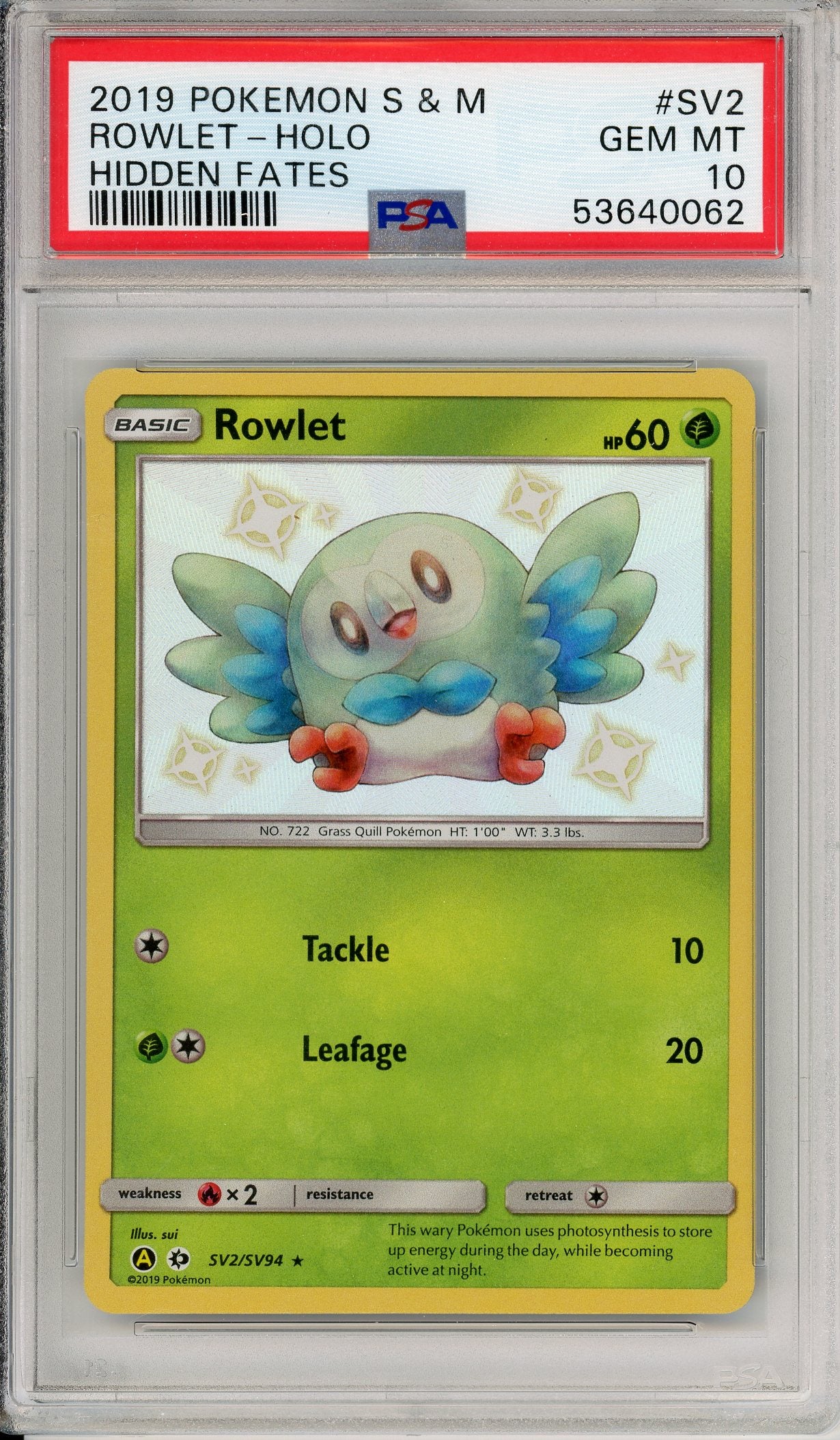 Pokemon Graded: Rowlet SV2/SV94 Hidden Fates (2019) Shiny Holo PSA 10